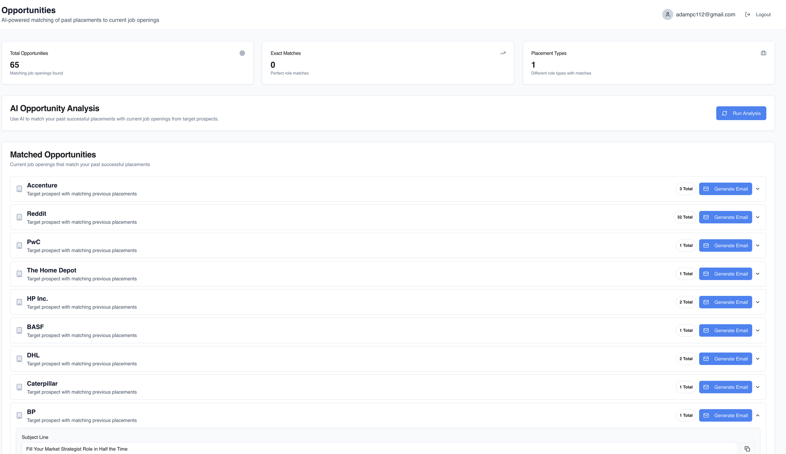 A tool for recruiting agencies built to help automate prospecting by new job listings from career sites, automatically matching them with previously filled positions, and drafting outbound emails to send to potential prospects. Built custom for PeopleLift